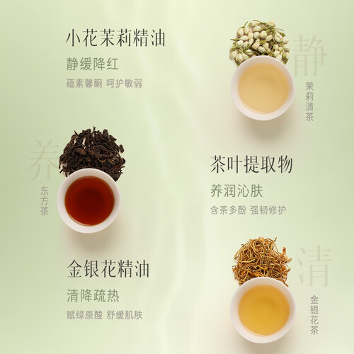 源自古树茶园的养护成分,绿色健康,展现东方智慧。添加普洱提取物,富含茶多酚精华,让肌肤屏障更加强稳。
