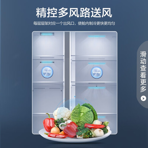 通过一级矢量双变频,提升控温精度,也能减少电量使用。通过多风路送风,有效提升制冷速度,守住食材新鲜。