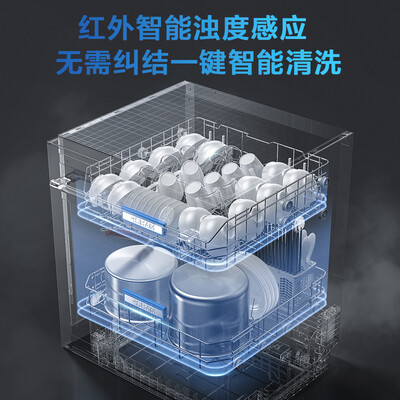 拥有13套洗涤大容量,可以同时清洗95件餐具,并且搁架可调节,汤锅、炒锅、电饭煲内胆都能一次摆放清洗。