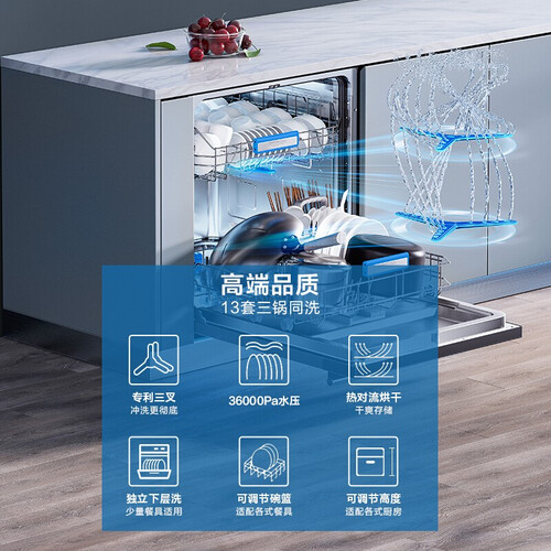 自带排渣系统,不用手动处理,一步到位操作,不堵塞无异味。13套超大容量,餐具一次洗净更省心。