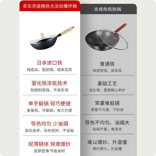采用进口钢材,高纯度精铁,十分适合爆炒,越用越不粘,延长了使用寿命。锅体表面无化学涂层,安全健康,还十分耐磨。