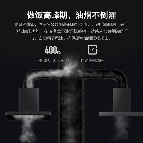 53分贝的轻音设计,有效避免噪音的干扰,为家人安静的准备早餐。自动巡航增压技术,做饭高峰期油烟不会倒灌。
