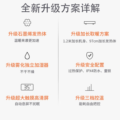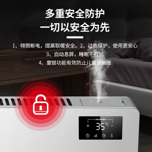 低音运行设计,整晚加热不扰睡眠。24h定时功能,无需半夜起身手动关机,使用更加方便省心。IPX4级防水,呵护家人安全。