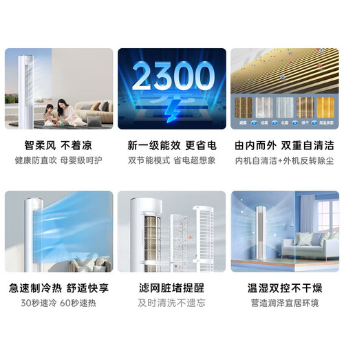 30s速冷,60s速热,制冷制热速度快,舒适温度无需久等。立体送风,72种送风角度实现气流精准导向,风向随心掌握,生活更舒适。