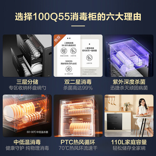 搭载PTC热风循环系统,加速蒸发餐具表面水分,净味防潮,内外兼顾干爽久存。三层专区分储,可轻松收纳6-8口之家的餐具。