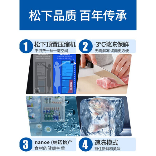 零下3℃微冷冻模式,保鲜同时更锁味,口感不变吃的香。压缩机置顶安装,释放下层空间,提升了收纳的能力。