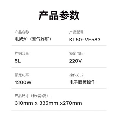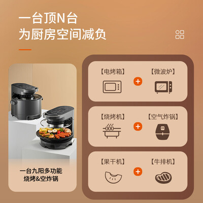 空气炸和多功能烧烤,能应对不同的烹饪需求。5L大容量,一次可烹饪大量食材。室内烧烤时无油烟,方便在家烤肉聚餐。