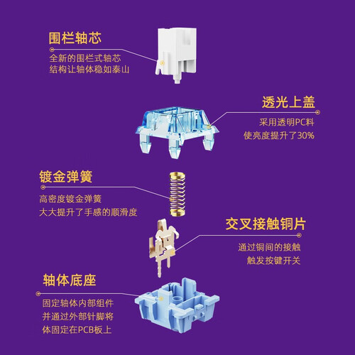 采用98%配列布局方案,保留了数字键区,为用户带来更加完整的使用体验。围栏式轴芯结构,让轴体稳如泰山,大大提升了手感的顺滑度。
