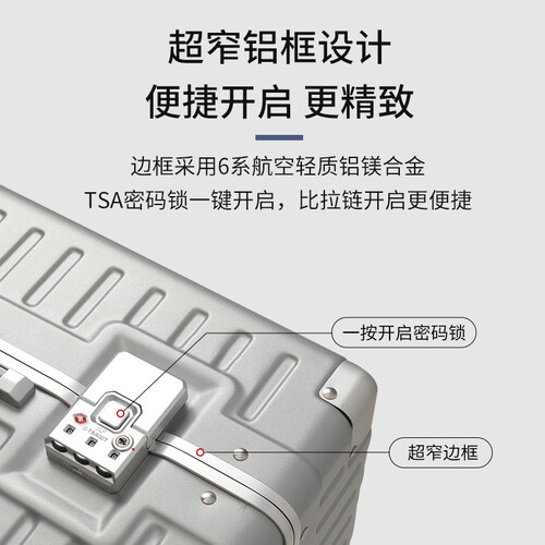 配有TSA双密码锁,降低物品被盗取的风险,提升使用安全性。加厚金属防撞包角,坚如磐石无惧磕碰,托运更放心。