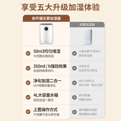 集净化和补水,还有加湿为一体的无雾加湿器,可以轻松满足整个屋子的加湿。4L容量,一次加水可使用一天。