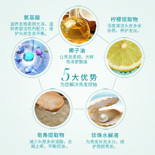 添加天然皂角去屑止痒成分,温和养护头皮,净爽去屑,让您感到清爽舒适。添加氨基酸、椰子油成分,有效保持秀发和头皮健康。