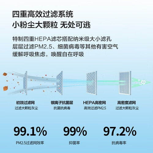 利用微正压新风换气技术,36分钟即可焕新全屋空气。四重过滤系统,有效的过滤掉PM2.5、细菌病毒,让你呼吸到新鲜干净的空气。
