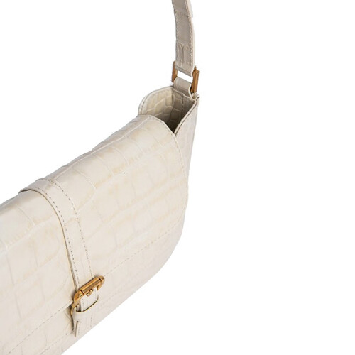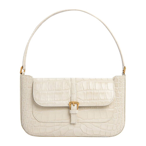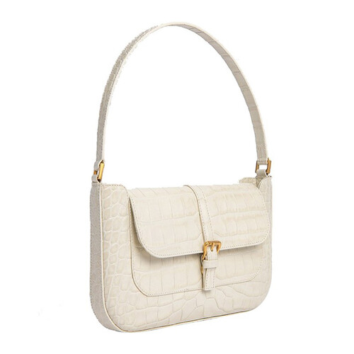 奶油色包包,使用鳄鱼纹皮质材料制成,纹理清晰自然。添加精致五金配件,呈现亮丽光泽,时尚经典。
