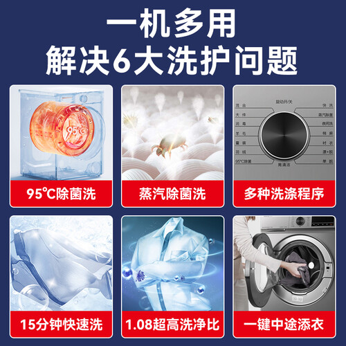 95°C高温洗涤模式,深入纤维内部,清理有害物质,呵护你的小敏感。10公斤大容量洗涤空间,大型家纺可以轻松洗涤。