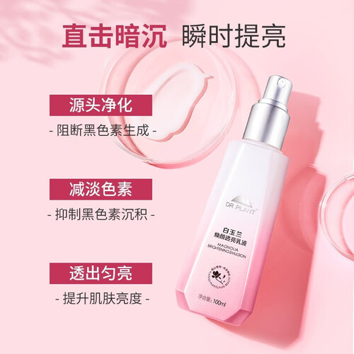 可从源头净化黑色素,减淡黑色素,令肌肤亮度持续提升。含有白玉兰、烟酰胺,帮助美白提亮,改善暗沉。