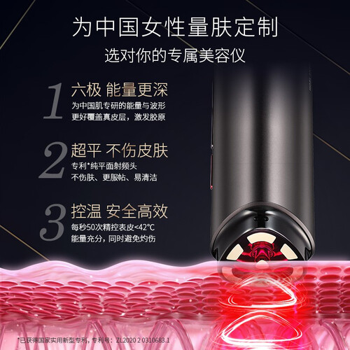 针对中国肌肤设计的六极射频,能更好的覆盖真皮层,激发皮肤的胶原蛋白。内置温控系统,每秒检测50次,保证皮肤不会灼伤。