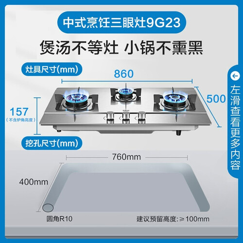 500Pa大风压,畅行公共烟道,不惧排烟压力;选用三眼燃气灶,煲汤炒菜同时进行,节省烹饪时间。
