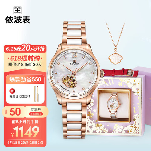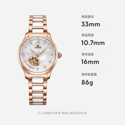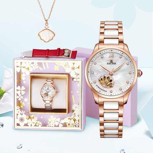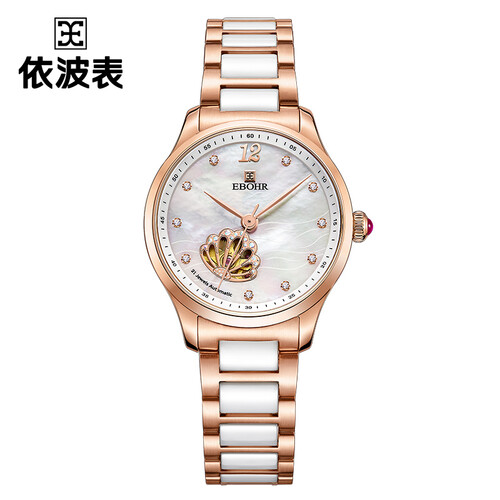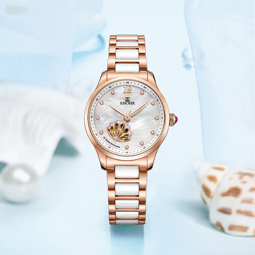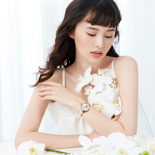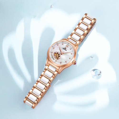 深海纯净母贝融入盘面,柔光淡彩,贝壳形镂空窗点缀,演绎大自然的变幻之美。红锆石镶嵌表冠,像少女盛开的蓬蓬裙,灵动俏皮。