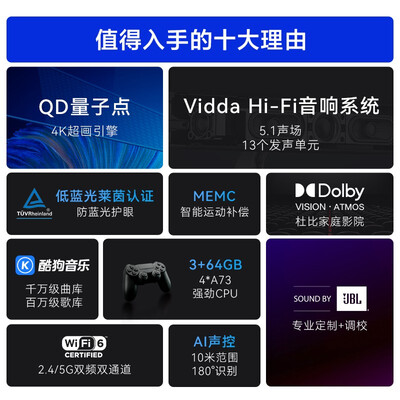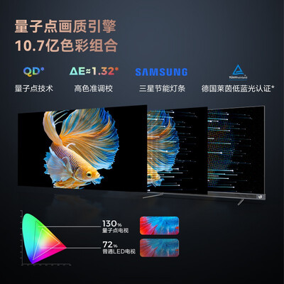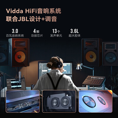 采用JBL专业环绕声音响设计方案与百瓦前出音响,声音通透又立体。搭配量子点130%高色域技术,画质饱满,色彩更亮丽。