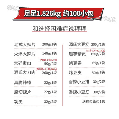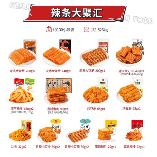 老式大辣片,麻辣鲜香,劲爽过瘾,爽口更畅快。源氏大刀肉,大块筋道,香辣可口,轻松应对休闲时刻。