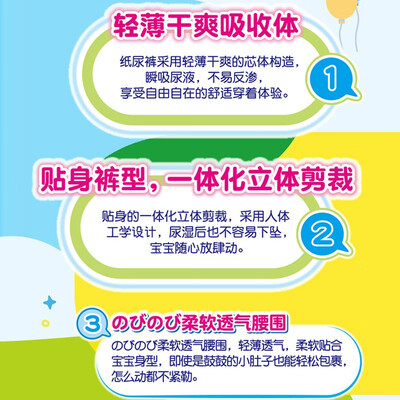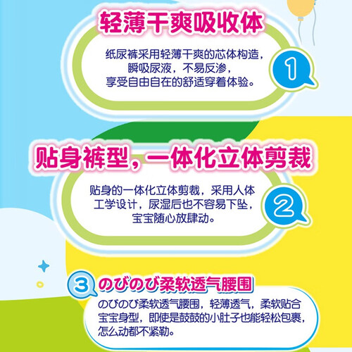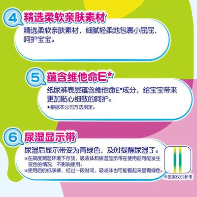 丰富的维生素E成分,贴合宝宝肌肤非常柔顺,以免造成干燥起皮的现象。尿显功能,方便宝妈掌握宝宝情况,及时更换以免宝宝哭闹。