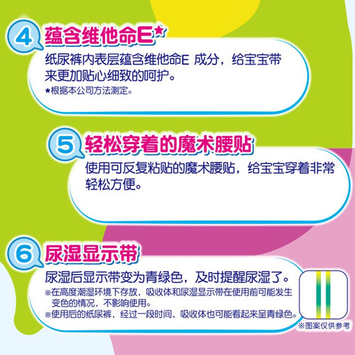 轻薄瞬吸的芯体,大尿量宝宝穿戴也很合适,快速吸净给肌肤干爽的环境。立体弧形设计,贴合身体曲线避免磨伤肌肤,活动无拘束。