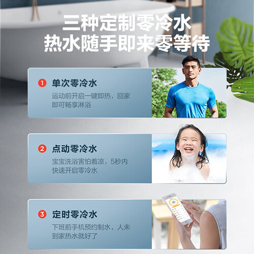 进出水管增加了电辅防冻块,即使是恶劣的天气,也能从容应对。三种定制的零冷水模式,热水随手即来。
