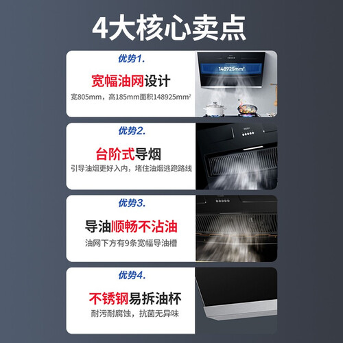 台阶式导烟,油烟循序渐进彻底排净,高峰期烹饪不怕倒灌。低噪音运转,烹饪静谧不嘈杂,让你享受轻松的烹饪时光。