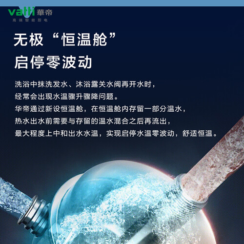 采用创新的无极恒温舱,开启和关闭时水温不会有波动。直流的变频水泵,出水量可以提高70%以上,实现畅快的洗浴。