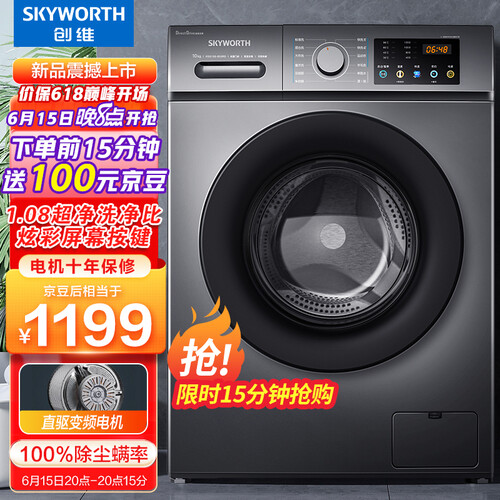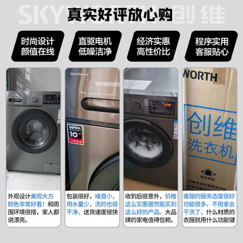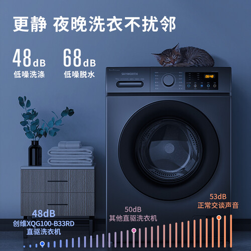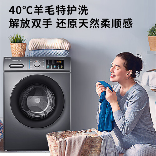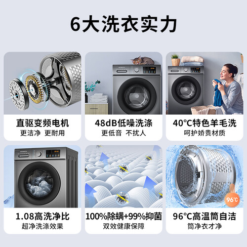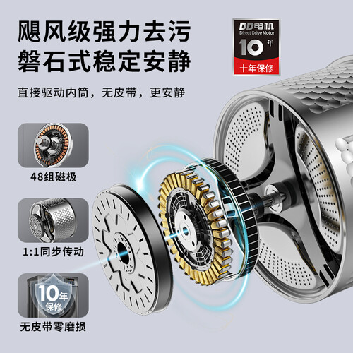 具备10kg大容量设计,更大的洗护空间,尽情舒展衣物,衣物蓬松有型。内置直驱变频电机,轻柔运行,营造静谧的洗护时光。