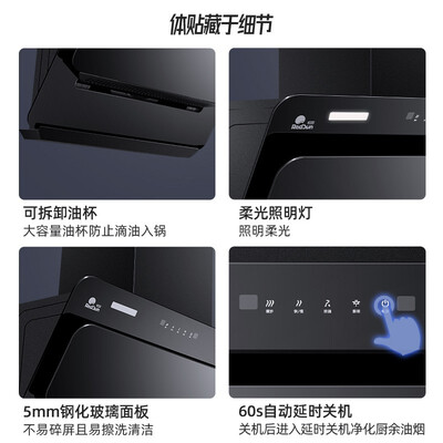 一键热除油清洗功能,不用加水一键自动喷洗,吸力更持久。三种可调节风力,按烹饪出烟量不同自定义风量,各种场景净烟游刃有余。