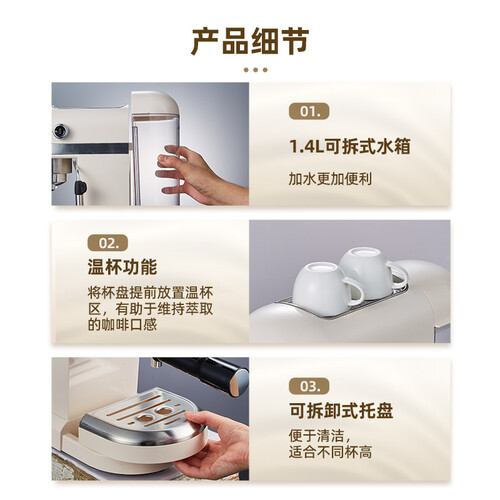 独立的温控系统,清晰掌握咖啡萃取温度,保留咖啡原本的香醇。可拆式的水箱设计,便于加水与清洁。