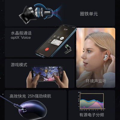 搭载混合主动降噪技术,可将周围噪声屏蔽,采用有源电子分频技术,准确发音,高度还原,体验出色听感。