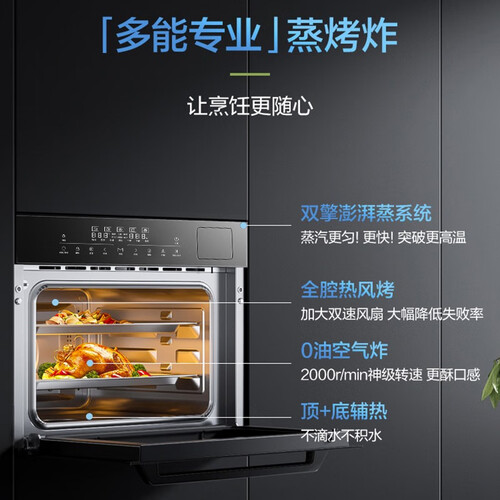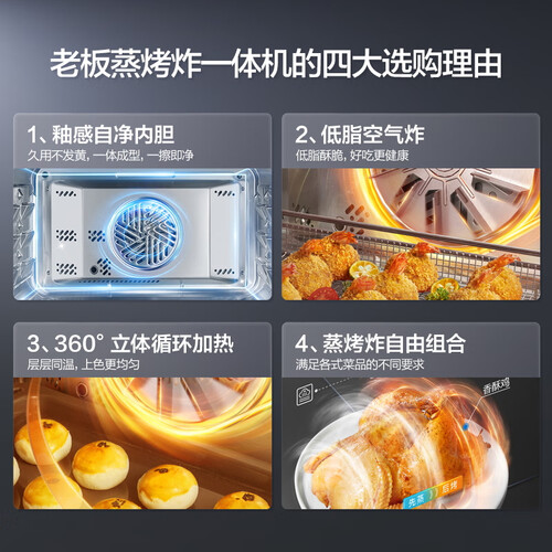 嵌入式多功能一体机,收纳不占地。兼具蒸烤炸功能,花样美食一机呈现。釉感自净内胆,久用不发黄,一擦即净,保养清洗更轻松。