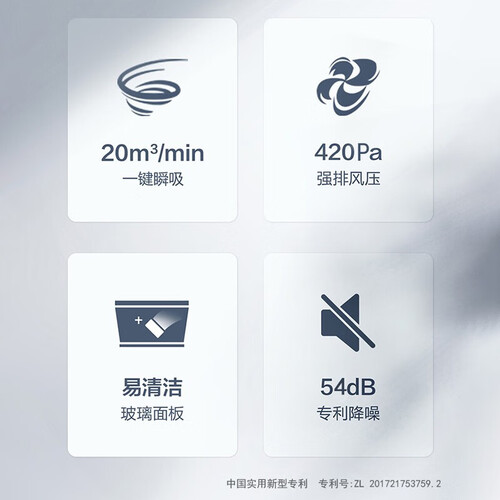 油烟机运行噪音低,安静烹饪不打扰。玻璃镜面面板,脏污一擦即净。