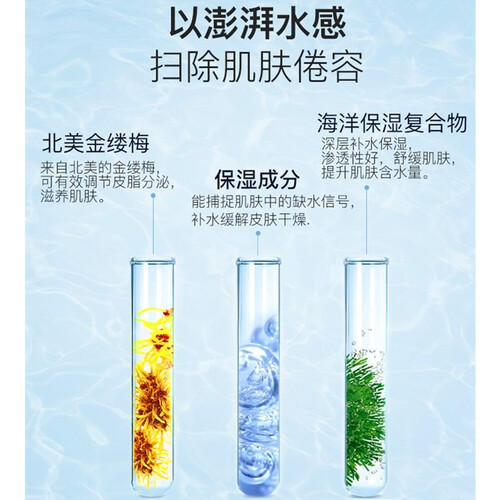 添加金缕梅精粹,能够减少毛孔油脂分泌,避免出油旺盛。含有海洋复合精华,可以深层渗透肌肤,深度补水长久保湿。