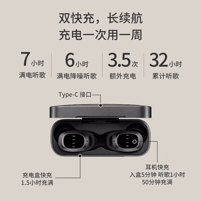 ANC主动降噪功能,隔绝外界噪音,给你安静的音乐空间。降噪关闭时,耳机可使用7小时,配合充电盒续航长达32小时。