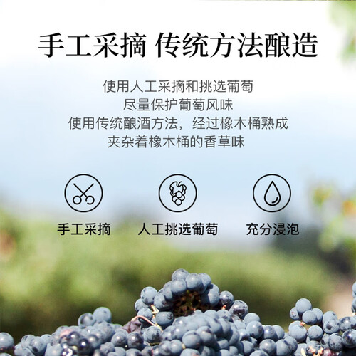 严选优质的葡萄经由传统工艺酿造,丰富的果味夹杂着橡木桶的香草味,口感层次分明,酒体饱满,可轻松搭配中西多种美食。