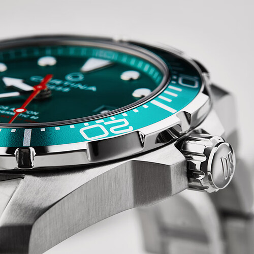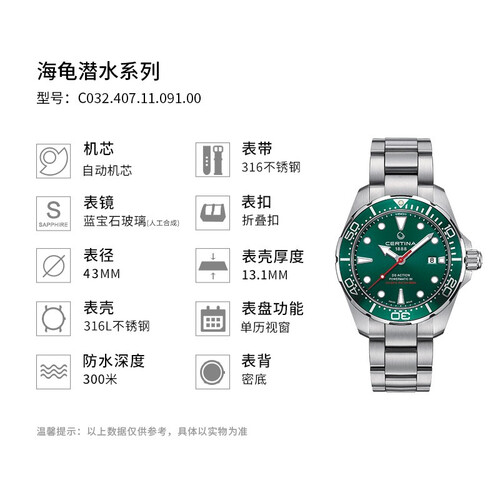 采用蓝宝石防眩目表镜,硬度高,且不易磨损,尽显出众品质;底部带有海龟标识,立体美观,佩戴尽显男士的坚韧精神。