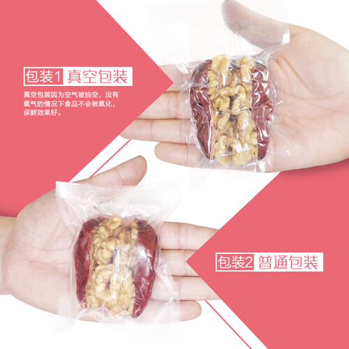 饱满大枣去核后,加入葡萄干和核桃仁,口感层次丰富,吃着更有食欲。属于真空独立小包,包裹严密不怕受潮。
