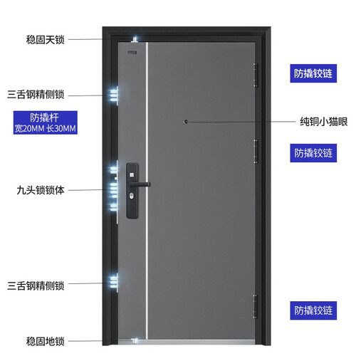 时尚简约灰色风格,提升家居整体档次。95mm门体厚度有效的隔离噪音,安静不扰睡眠。九头锁锁体更加安全。