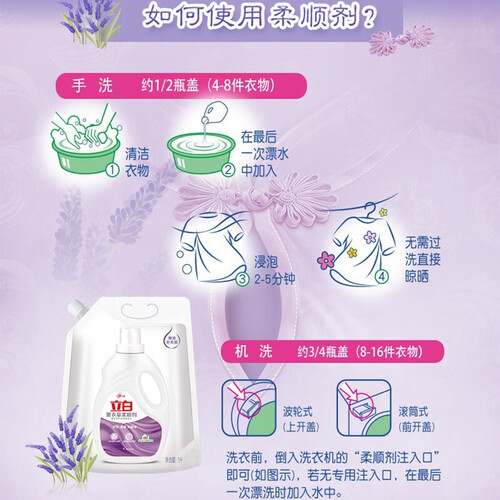 选用自然柔顺成分,舒缓怡人的薰衣草香令人心情愉悦。无需漂洗,使用跟方便,适用于各种材质衣物。