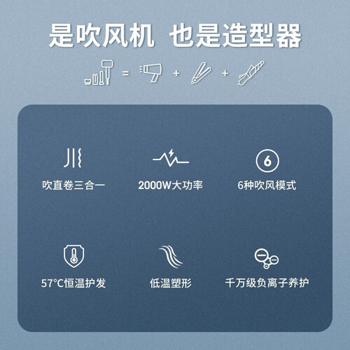 吹/直/卷三合一,满足你多样化的使用需求,是都市丽人打理头发的好帮手。六种吹风模式,吹发干发更合你的需求。