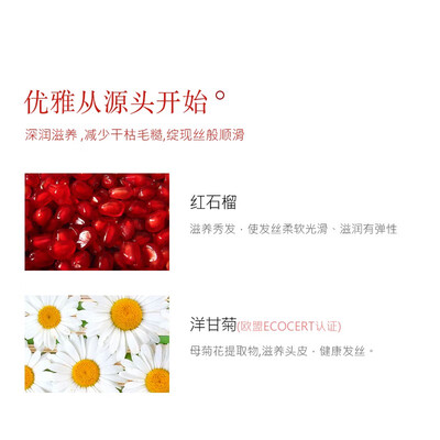 蕴含红石榴精华,滋养发丝,另秀发柔顺光滑。含有洋甘菊提取物,有效减少头发干枯毛躁,让秀发更加健康。