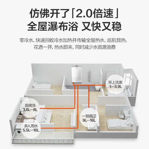 采用零冷水科技,花洒一开,热水即来,不等待更畅快。采用双涡轮增压技术,18升充沛大水量,拯救低水压用户。