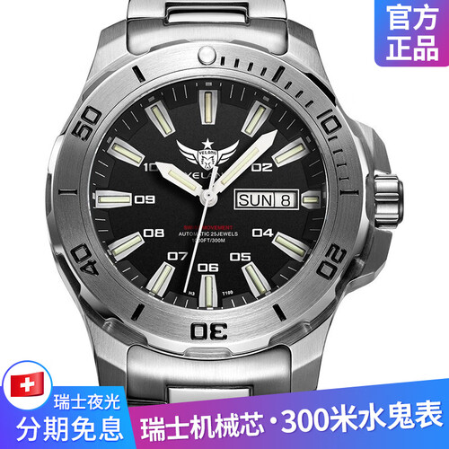 一款深潜的防水机械表,拥有单向旋转60分钟的刻度表圈,自由掌控时间,精准安全。硬朗大气的外形,魅力四射,演绎个性。
