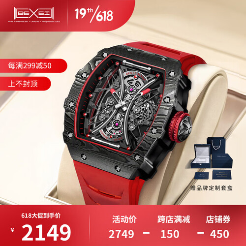 精钢材质的表壳,具备很好的强度,更好地保护内部元件。酒桶型镂空表盘,清晰可见齿轮转动,更好地体验机械韵律。