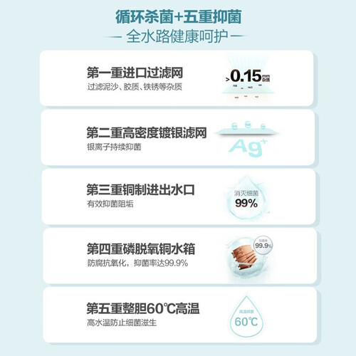 支持五重净化,有效抑菌,保持水质的清澈安全,呵护家人娇嫩肌肤,更适合有娃家庭使用。