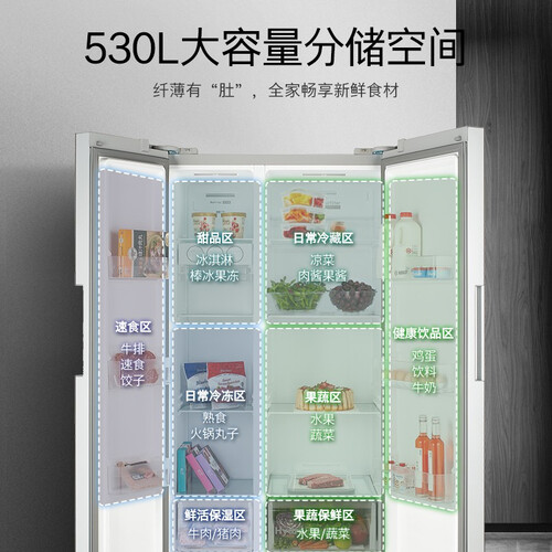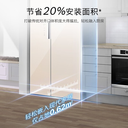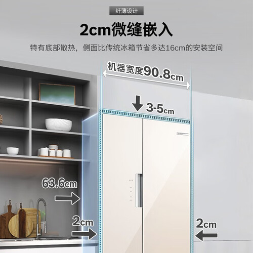 采用底部散热设计,让侧面可以减少预留空间,实现2cm微缝安装。冷藏室设有铂金净风装置,有效抗菌去异味,守护食材安全。