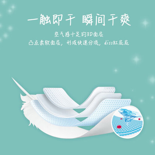 2毫米超薄厚度,贴合宝宝屁屁,减少宝宝负担,轻薄不闷热。采用3D面层设计,柔软舒适,一触即干,随时保持干爽舒适。